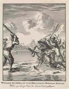 During a battle near the village of Hoogwoud, dressed in body armor and seated on his horse, William found himself lost on a lake and crashed through the ice. The West Frisians skated toward him. They found him in a helpless position and killed him. We don’t know if the horse survived. The Frisian-Hollandic Wars were waged off-and-on from 1256 into the 1400s. There is no record of any more battles on Ice.