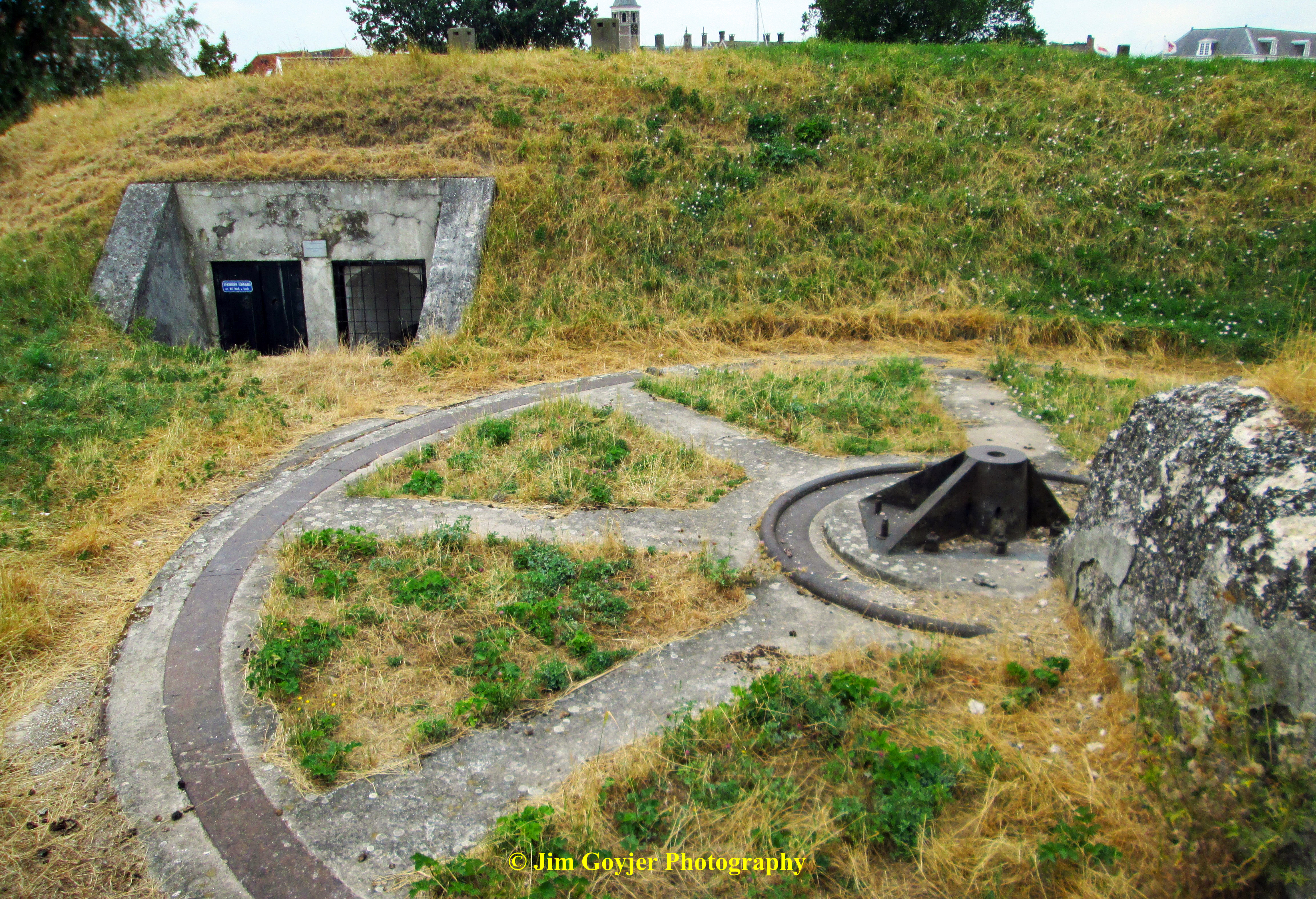 Willemstad has seven bastions named after the seven original provinces of the Dutch Republic in the 16th century. Bastion Holland faces west toward the open sea on the wide waterway called Haringvliet. Between 1940 and 1945, to defend the entrance of the Hollands Diep, two German gun casemates and large bunkers with an underground labyrinth of passageways and rooms were built on the old ramparts of Bastion Holland. A casemate, also known as a pillbox, is a small cement enclosure in the wall of a fortress, with openings from which guns or missiles could be fired. The anti-aircraft gun positions can be seen as you walk through the eerie series of bunkers.