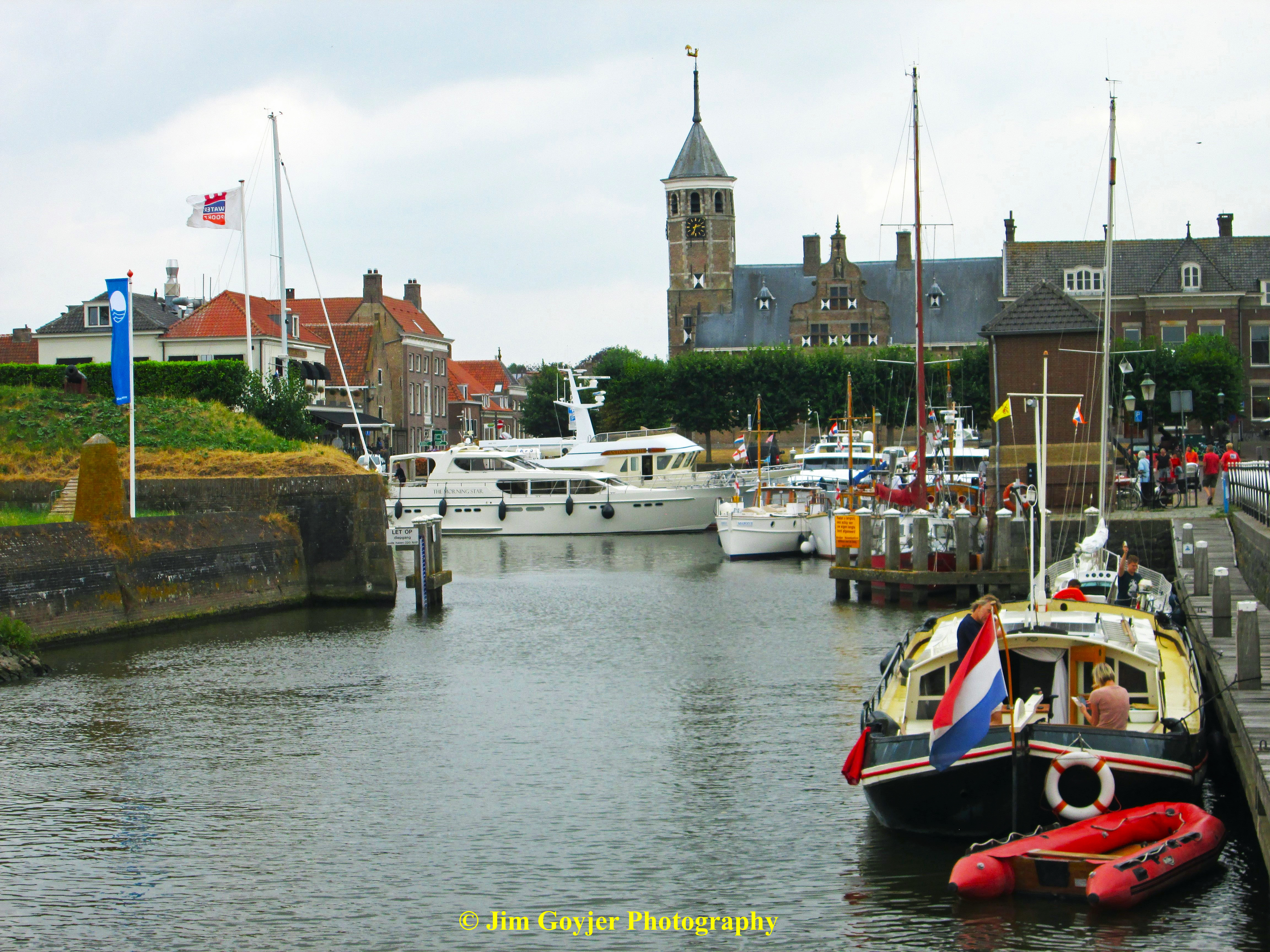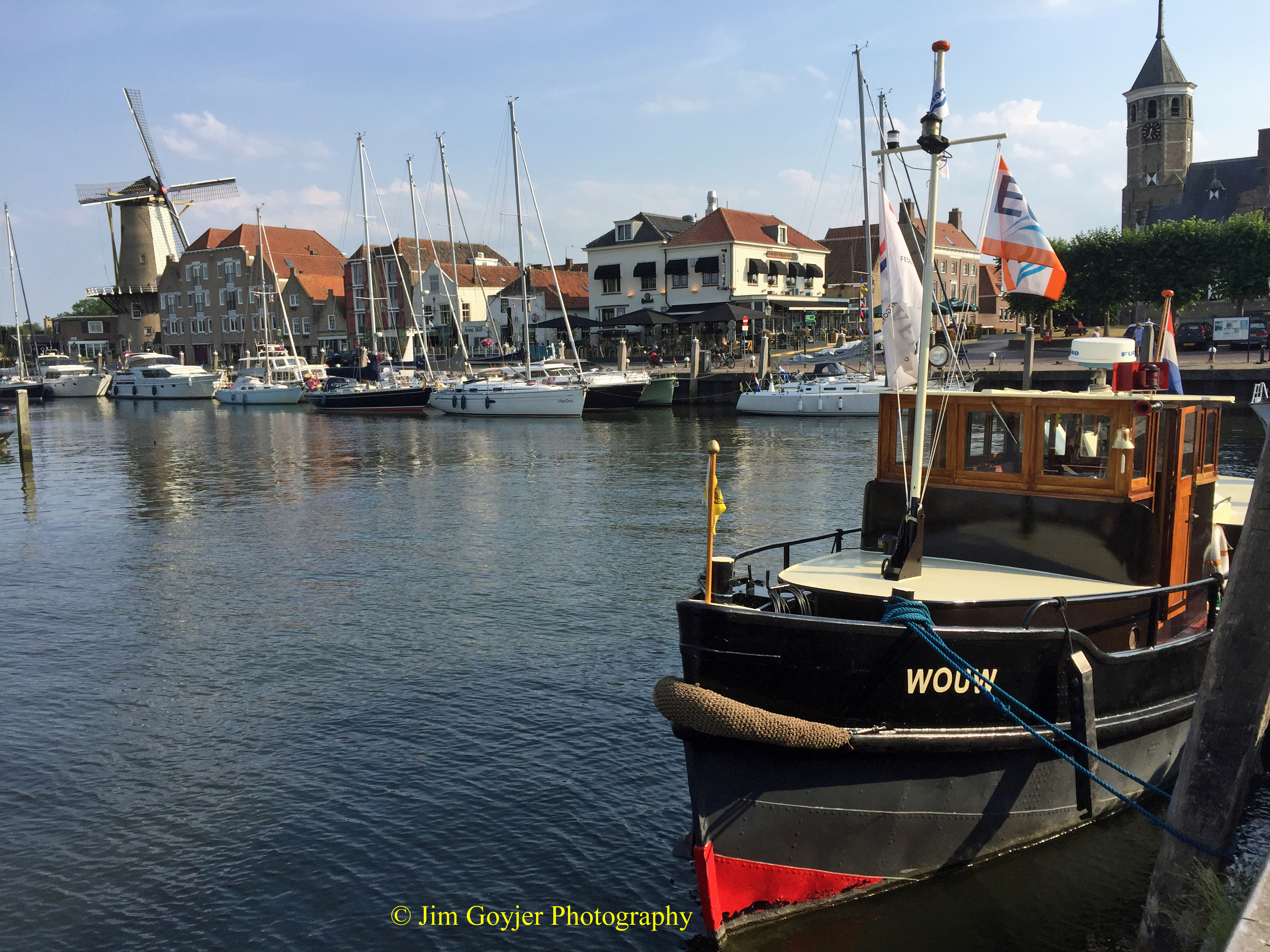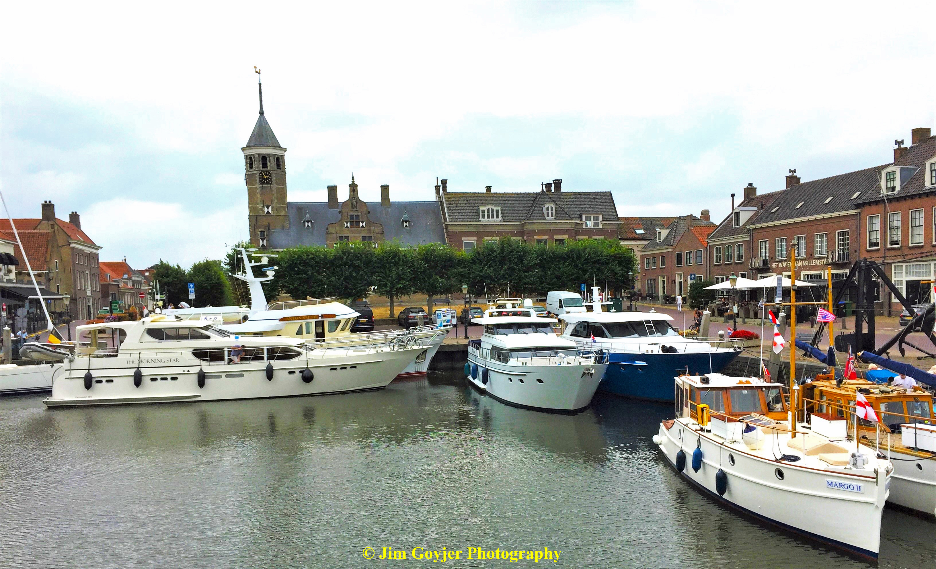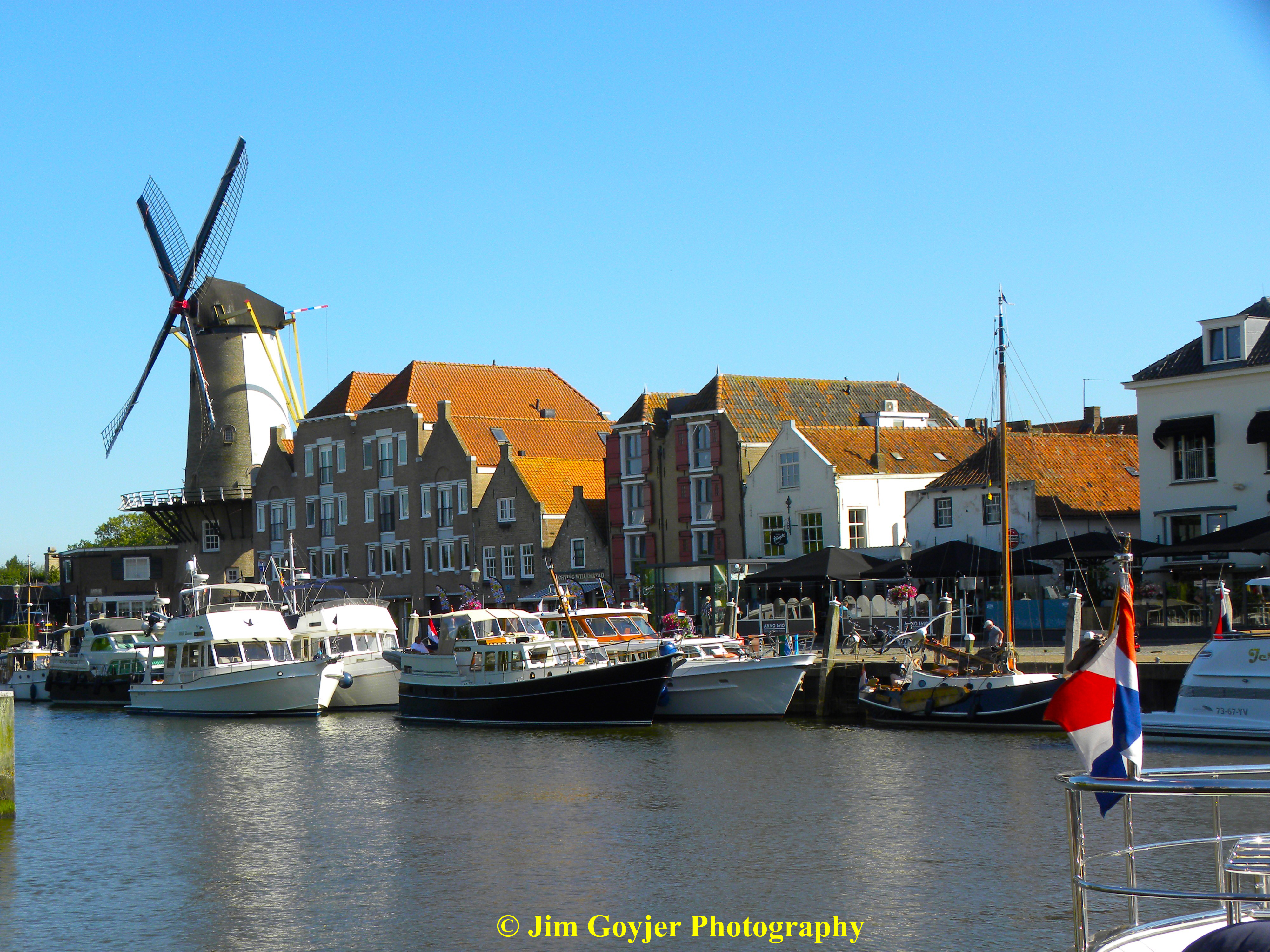 Willemstad, in the Netherlands, has the charm of a storybook village with a small historic quaint harbor where very expensive yachts are snugly anchored side-by-side. Within a few meters of the dock is a row of restaurants where you can overlook the harbor while enjoying a quiet relaxing lunch, dinner, or a drink. A stately white windmill at the harbor’s end, sitting on a rise, has the dominance of a harbor master. The former flour mill is now a magnificent private residence.